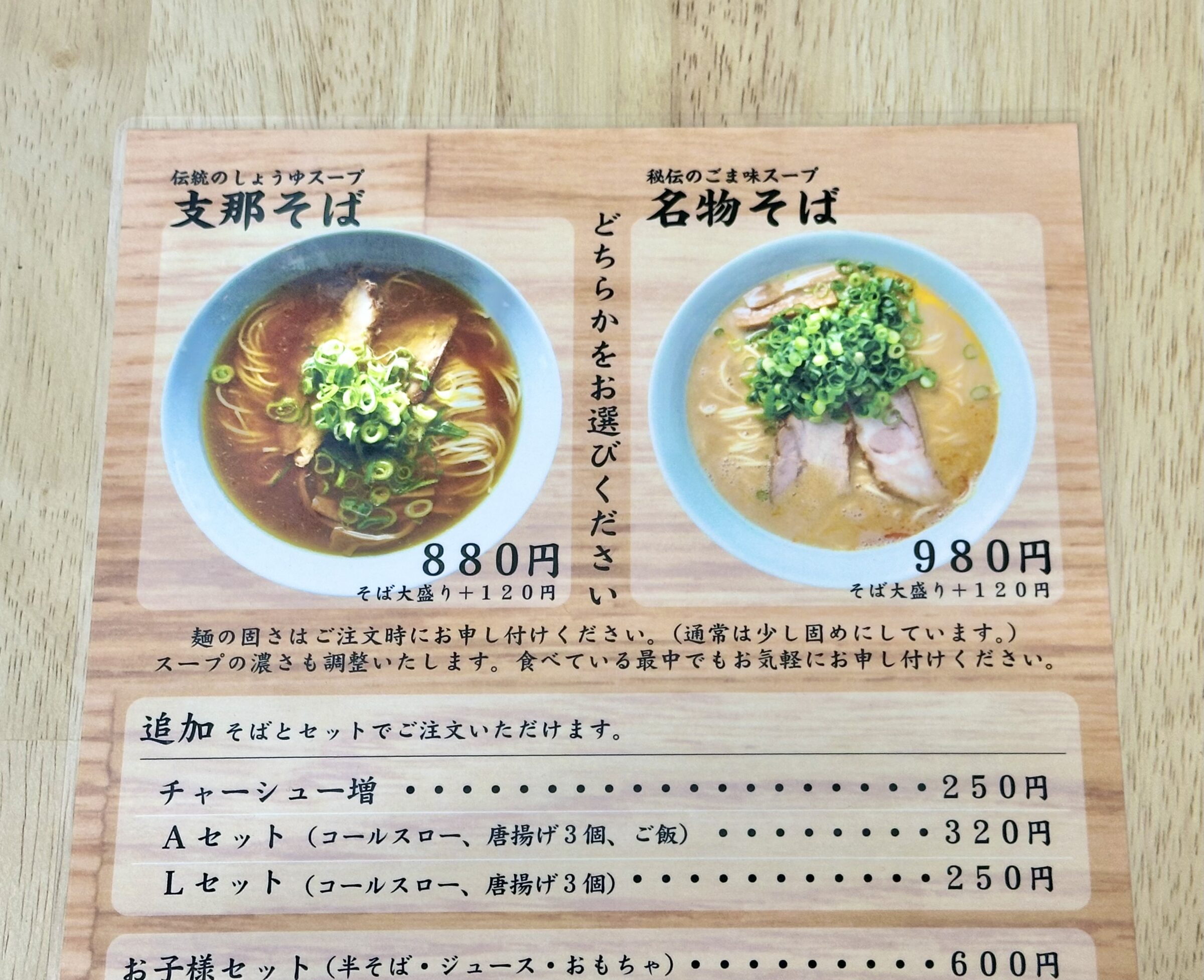 メニュー。”餐休さんといえば”の、「支那そば」とゴマ風味の「名物そば」。セットや単品もあります。