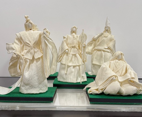 丹後八姫会は、地域に伝わる静御前、間人皇后、小野小町、乙姫、羽衣天女、細川ガラシャ、安寿姫という「丹後七姫」に川上摩須朗女を加えた「丹後八姫人形」を制作。細部までこだわった装飾に、作家の手仕事による技が光る。