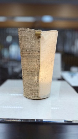 和びデザインと共同開発した「藤布あかり」33,000円(税込)は、縄文時代から伝わる織物「藤布」と手漉き和紙を組み合わせたルームライト。藤布のもつ野趣あふれる深い味わいがあたたかみのある影を生み出し、豊かな時間をもたらす。