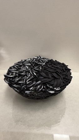 「ガラスオブジェ・景(シーン)」120,000円(税込)は、光を拒むように真っ黒な日本海に照らしだされた大漁という光を見い出すワンシーンだ。