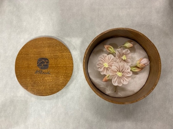 「asowood. flower」34,000円(税込)は、丹後の木を角材から削り出し、薄く継ぎ目のない滑らかな曲線のアクセサリーケースと、季節の花をモチーフとしたつまみ細工のブローチ。