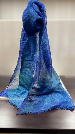 染色工房 嶋津は作品の開発から縫製まで一貫して行うほか、染色体験等を実施。シルク100%の「ぼかし染めストール」9,900円(税込)は、丹後の生地を一枚一枚手染めしたOnly Oneとなっている。