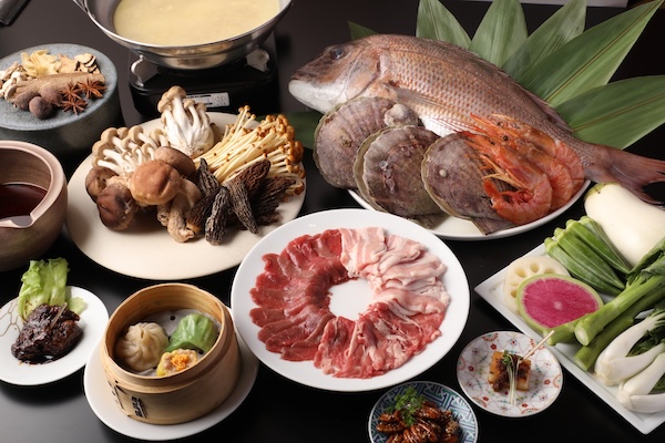 デトックス効果を存分に体感できる「極上四季彩養生コース」12,000円(税込)は、季節の前菜としてフカヒレ、漢方・特撰お肉4種・魚介4種・野菜10種の鍋、点心2品、〆の麺か炒飯に、デザートと中国茶が付く。