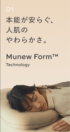 新素材「Munew Form」は、まるで人の肌に触れているかのような、安心感のあるやわらかさとぬくもりを実現。頭を乗せた瞬間、すっと力が抜け、理性が溶かされるような心地よさに包まれる。