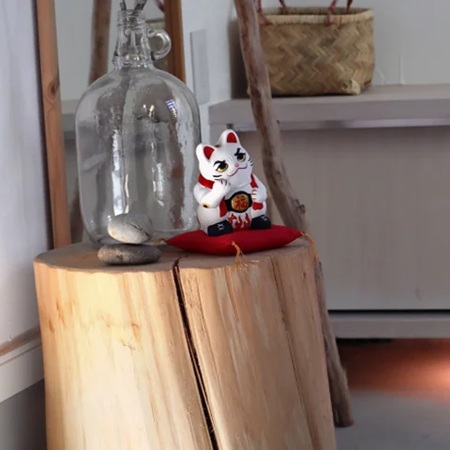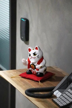右手上げは金運や幸運を招いており、色が白または白地に三毛猫の斑だと「開運招福」「商売繁盛」という意味がある。玄関やお店の入口、オフィスの受付など目につきやすい場所に置くとよい招き猫。「来いや猫」を玄関に置いておけば、お出かけの際は気合を注入し、帰ったときには元気に出迎えてくれる。オフィスにおいても話題作りに一役買うこと間違いなしのインパクトだ。