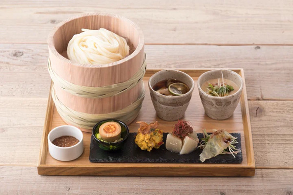 併設の「しょうゆ蔵のレストラン」では、“しょうゆの美味しさを出汁で伝える”をコンセプトに、自家製めんのうどんメニューを中心に展開。木桶職人がハンドメイドでつくったちいさな木桶にうどんが入った「木桶うどんおばんざいセット」、しょうゆの味比べができる「食べ比べうどん」の他、