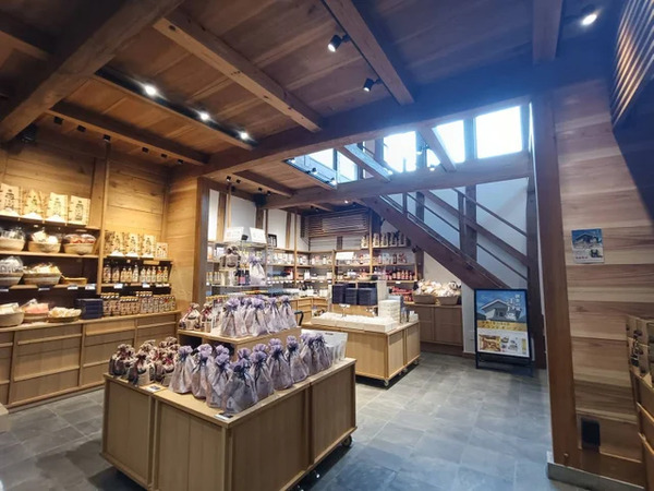 「江戸蔵」内は2階建て。1階の金笛ショップでは、しょうゆをはじめドレッシングやせんべい、地元の銘菓とコラボした「おしょうゆ五家宝」、自社工房で製造するバウムクーヘンや醤油皿、江戸蔵限定セットなどのグッズが並び、定番から新商品まで幅広く買い物を楽しむことができる。