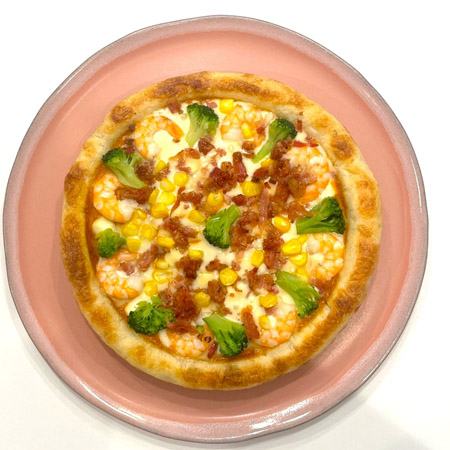 「海老とブロッコリーのアメリケーヌソース」は、海老と完熟トマトの旨みたっぷりの濃厚なアメリケーヌソースに海老、ブロッコリー、ベーコンをトッピングしたピザ。