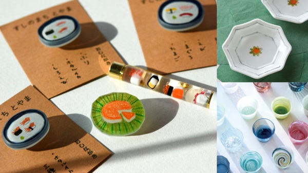 寿司のスノードームボールペン、おすしブローチ、CHOCOchocoなど、ガラス作品の展示販売を行う。
