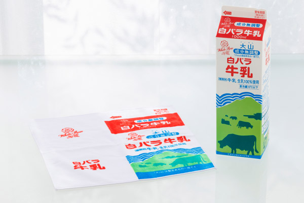 また、折り方によって図柄が変わるデザインになっており、半分に折ると白バラ牛乳のパッケージデザインに。