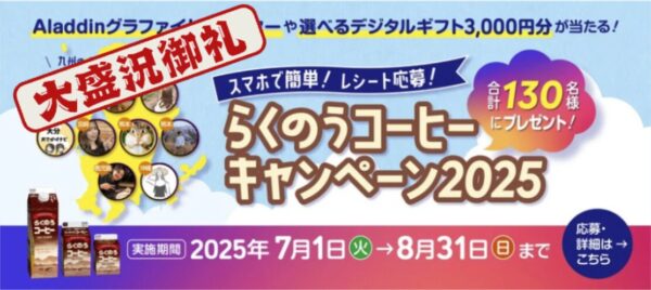 同キャンペーンは、“九州初”となる九州・沖縄全8県のインフルエンサーを巻き込んだPR企画として展開。対象商品「らくのうコーヒー」を購入したレシートをスマートフォンで撮影し応募する手軽な形式が関心を集め、多くの参加があったという。