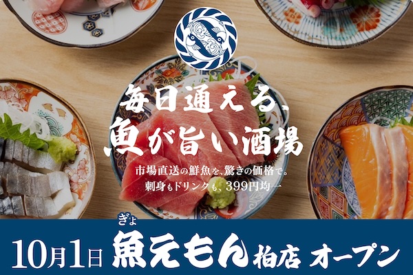 「コスパ系居酒屋・均タロー」を運営するジュネストリーは、豊洲市場から直送される新鮮な魚介メニューを中心とした新ブランド「毎日通える、魚が旨い酒場 魚えもん」を10月1日(水)に千葉県柏市でグランドオープンする。