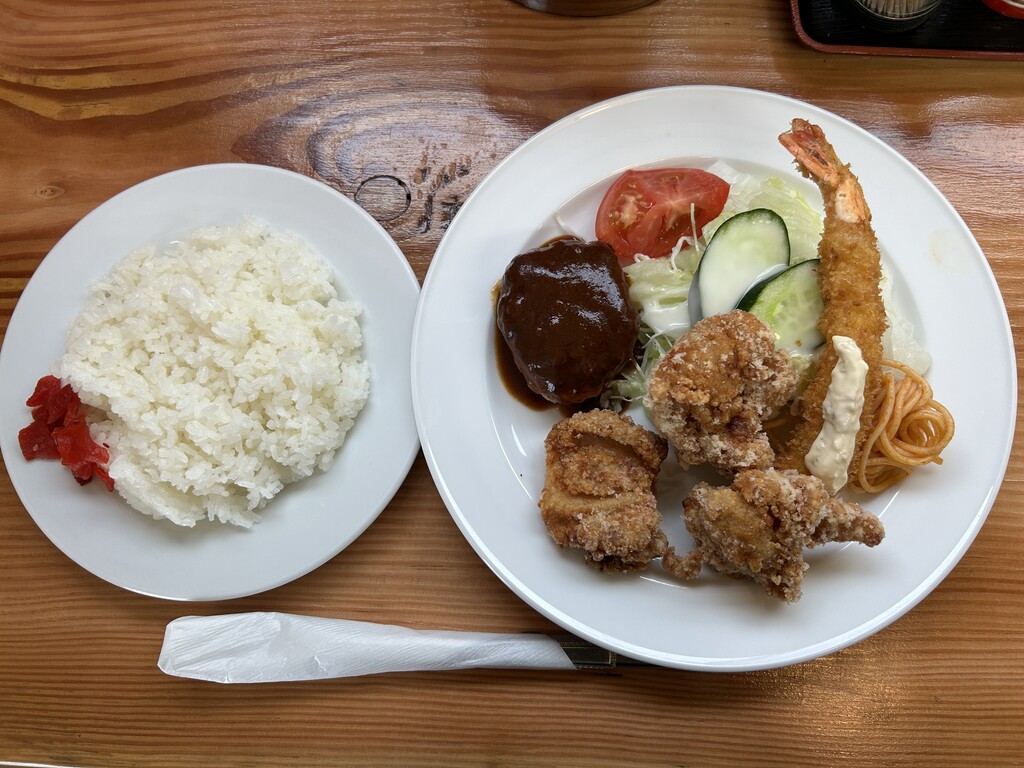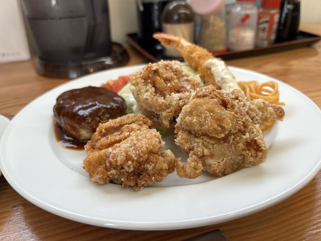 からあげ、ハンバーグ、エビフライの大人のお子様ランチタイプです♪
