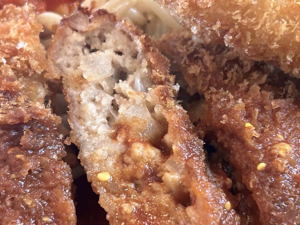 粗挽きジューシーで、マスタード入りのウスターソースが