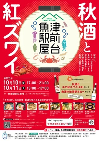 魚津観光まちづくりは、10月10日(金)・11日(土)の2日間、魚津産の紅ズワイガニと地酒を気軽に満喫できる屋台イベント「魚津駅前屋台~秋酒と紅ズワイ~」を、富山県魚津市にある、あいの風とやま鉄道の魚津駅前で初開催する。