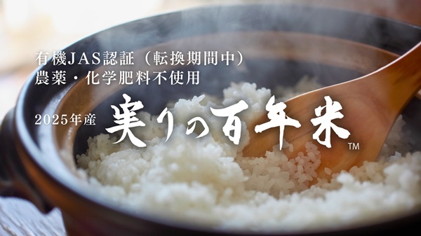 ひとつは、農薬・化学肥料を使用せず、周辺圃場からの農薬飛散の影響を受けにくい環境で有機JAS規格に沿って栽培した「実りの百年米(有機JAS認証・転換期間中)」だ。