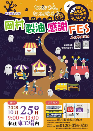 創業明治25年より綿実を搾油した綿実油(めんじつゆ)や綿実油粕などを販売している岡村製油は、「岡村製油 感謝FES」を10月25日(土)9時~13時に大阪府柏原市の本社東工場にて開催する。