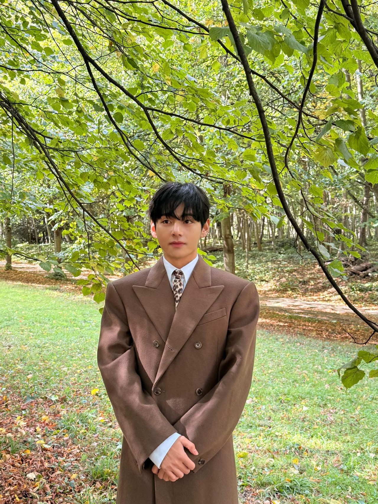 写真の中のVは、茶色のロングジャケットに水色のシャツを着て、華やかなネクタイをしめています。 清潔感のある服装からもVの“少年美”がにじみ出て、熱い関心を集めました。 特に、芝生に腰を下ろしてほほ笑みながら何かをじっと見つめる写真では、Vの遊び心あふれる魅力が際立っています。