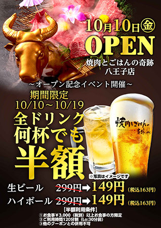 10月10日(金)~19(日)の期間中は、オープン記念キャンペーンを実施し、全ドリンクが何杯でも半額となる。