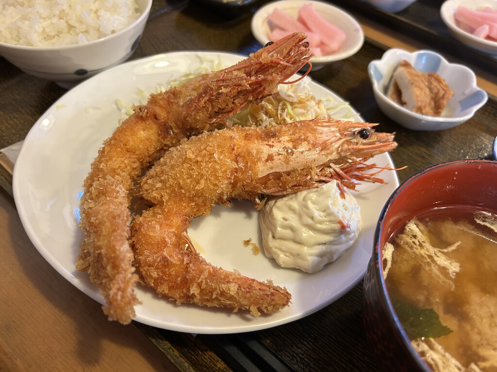 大エビフライ、小鉢2種、フルーツ、お味噌汁、ごはん、香の物の定食♪