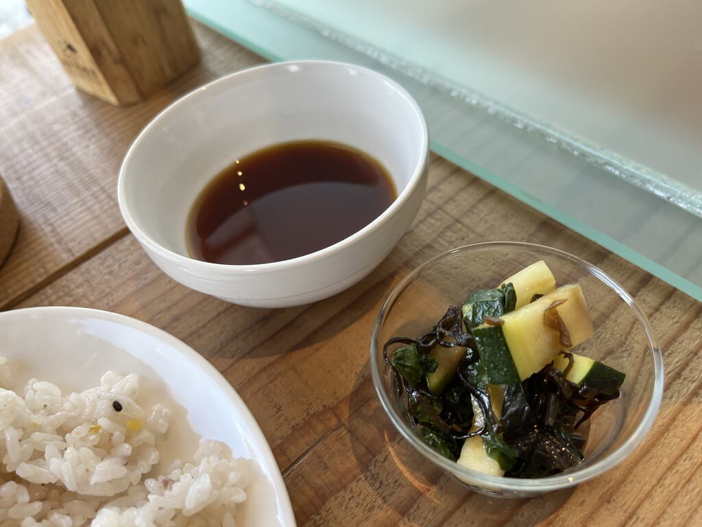 お野菜たっぷりハンバーグ。小鉢、サラダ、スープ、ライスのセット♪