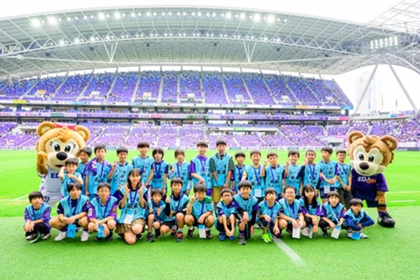 午後の部では、エディオンピースウイング広島へ移動し、トップチームの選手バスのお出迎え、なりきり選手体験やDJ体験、フラッグベアラーなどのキッズアクティビティでプロサッカーのセカイを体験できる貴重なプログラムを実施した。