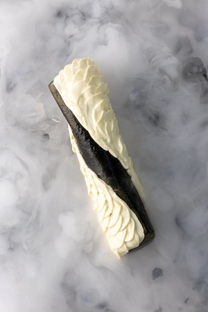 「ベージュ アラン・デュカス 東京」が販売する今年の「ブッシュ・ド・ノエル」は、黒と白のドレスを纏ったようなモダンでエレガントな佇まい。「ル・ショコラ・アラン・デュカス」のショコラで仕立てたフィヤンティーヌに、芳醇なバニラのビスキュイ、甘酸っぱい苺のマルムラードを重ね、柚子の香りを効かせた黒と白の軽やかなクリームで包んでいる。