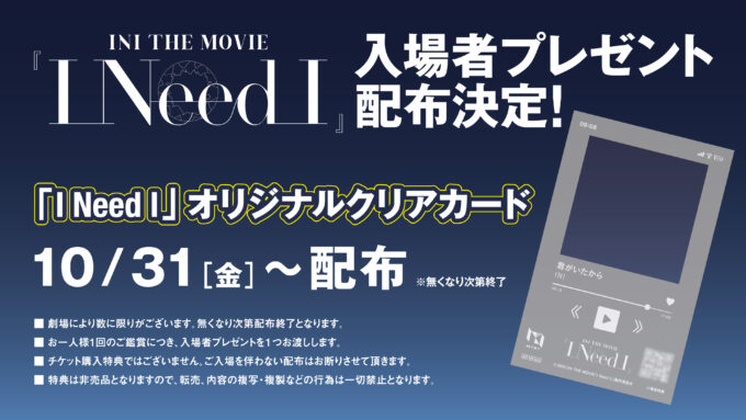 10月31日(金)に全国公開となるINI初のドキュメンタリー映画「INI THE MOVIE『I Need I』」の公開を記念して、公開日の10月31日(金)より、入場者プレゼント「『I Need I』オリジナルクリアカード」を配布することが決定しました。