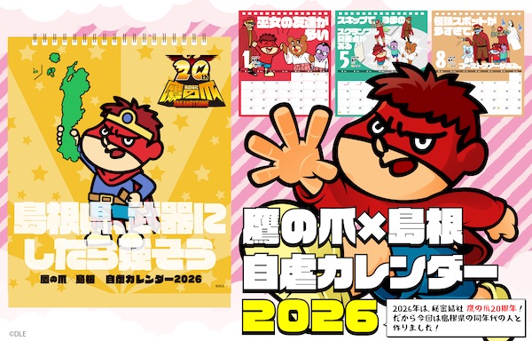 ディー・エル・イーは、島根ならではのあるあるを「鷹の爪団」のイラストとともに自虐的なコピーで紹介した「鷹の爪×島根 自虐カレンダー2026」が、10月3日 (金 )から販売開始した。「秘密結社 鷹の爪」は2026年で20周年。2026年版は、「秘密結社 鷹の爪」と同年代の島根大学の学生と製作を行った。