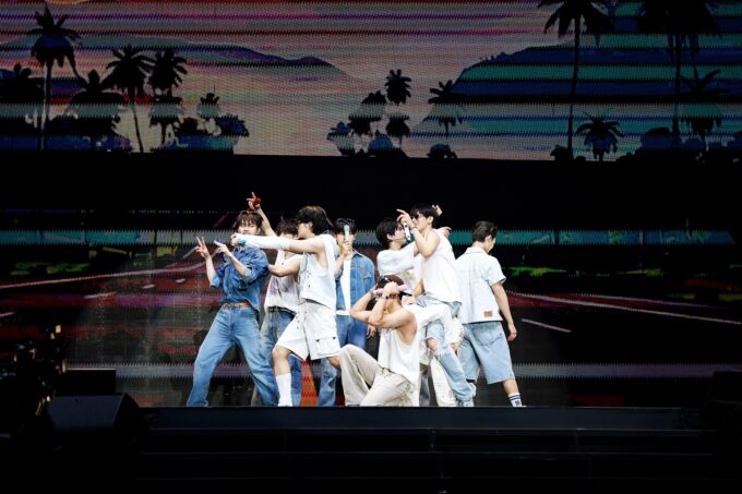 メインステージに戻ると、ヒョンジェ、ヨンフン、キュー、ニューも合流し、「bAd」のステージへ。クールでスタイリッシュなビートに乗せ、軽快なステップと笑顔で会場を揺らす。メンバーたちは「たのしー! たのしー!」と日本語で感想を伝え、ファンとの一体感を楽しむ。