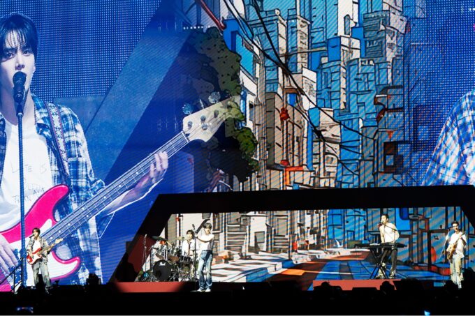さらに会場を熱くしたのは、「함께라서눈부셨던,서툴지만아름다운(一緒だから眩しかった、不器用だけど美しい)」 のステージ。キューはギター、ヨンフンはベース、ケビンはキーボード、ジェイコブはドラムを演奏し、歌やダンス以外でもファンの視線を釘付けに。そこへニューが颯爽と登場し、ヴォーカルとして加わると、「みんな叫べ!」と日本語で呼びかけ、会場を盛り上げる。清涼感あふれるポップロックサウンドに乗せて、「不器用でも一緒なら笑って進むことができる」というメッセージを届け、爽やかな風が会場を包み込んだ。