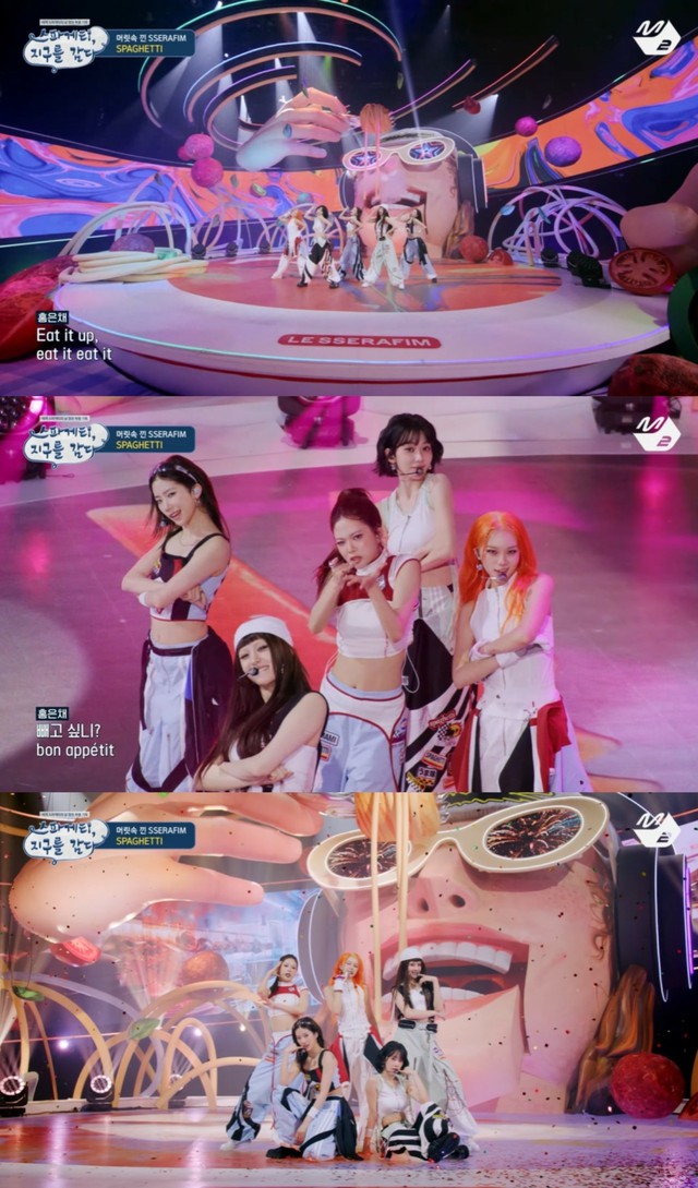 カムバック番組の最大の見どころはタイトル曲「SPAGHETTI (feat. j-hope of BTS)」のステージだった。 この曲は頭の中で何度もぐるぐる回り、思い出してしまう「LE SSERAFIM」を、歯にはさまったスパゲッティに例えた歌だ。 「噛んで、ほぐして、味わって、楽しんで、それでいいの」、「私のキムチポーズは相変わらずpriceless」といった料理に絡めたユニークな歌詞が“聴く楽しみ”を提供する。 5人のメンバーはスパゲッティのお皿のように装飾されたセットでパフォーマンスを披露し、“コンセプトへの没入感”を引き起こした。
