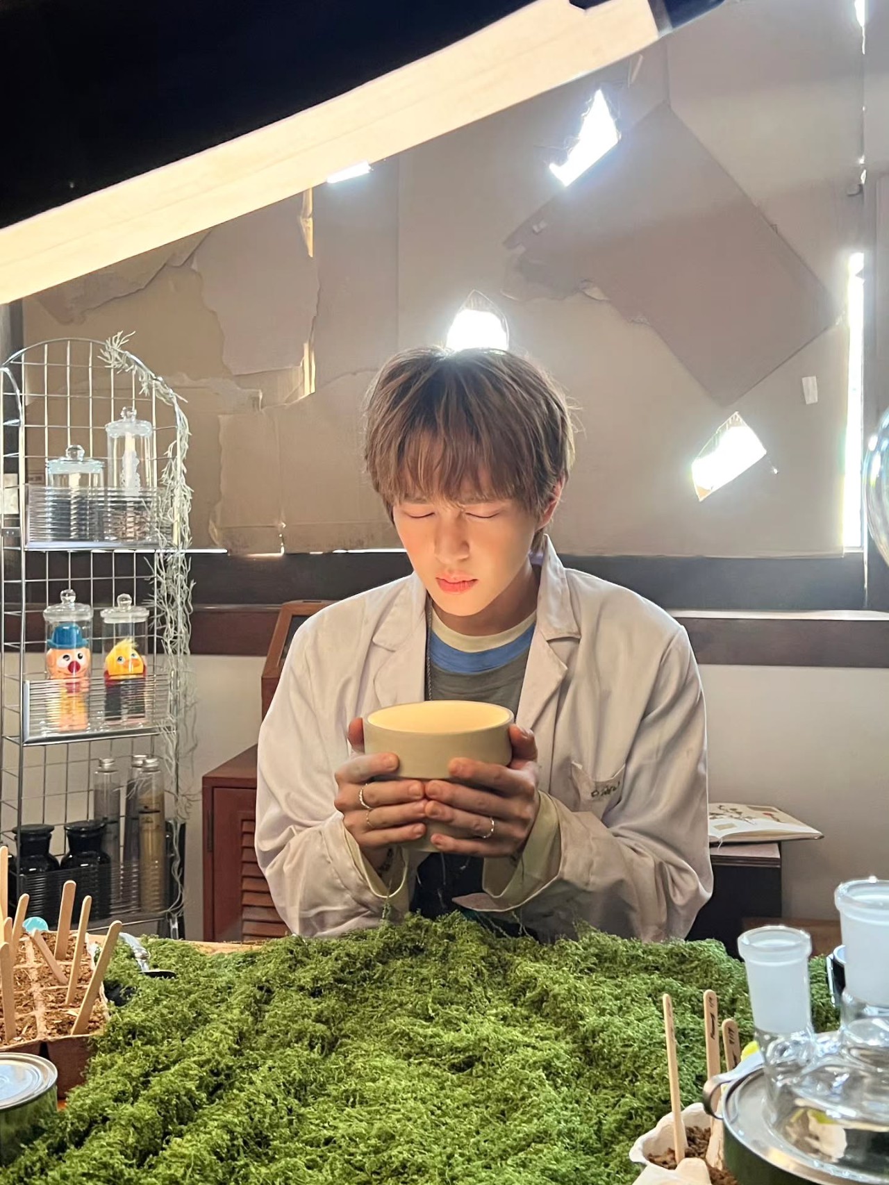 あたたかな照明に照らされた植物の間から、彼の淡い茶色の髪が自然に見え、研究者の姿と愉快な姿の雰囲気が交錯します。 オンユはうつむきながら、真剣で好奇心いっぱいのまなざしでフラスコをのぞき込んでいます。 整然とした空間、様々な小道具、そして膝をついた姿勢まで、写真全体が独特の物語とユーモアを秘めています。