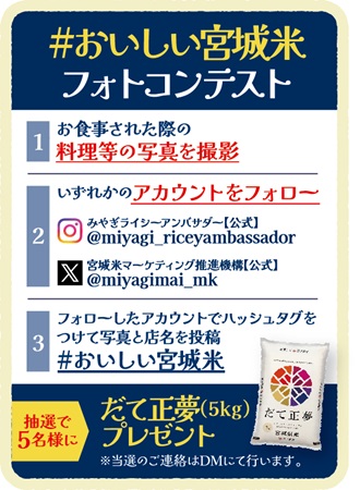 InstagramもしくはXの公式アカウントをフォローし、食事した際の料理などの写真を自身のInstagramやXのアカウントでハッシュタグ「#おいしい宮城米」をつけて写真と店名を投稿すると、「だて正夢」5kgが抽選で5名に当たる。当選の連絡はDMでの実施だ。