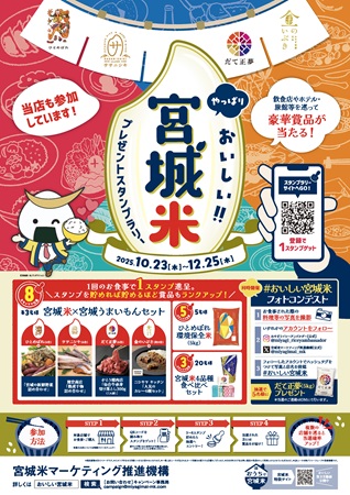 このたび、全国の提供店において、10⽉23⽇(⽊)~12月25日(木)の期間、「やっぱりおいしい!!宮城⽶プレゼントスタンプラリー」を開催。特設サイトをオープンした。