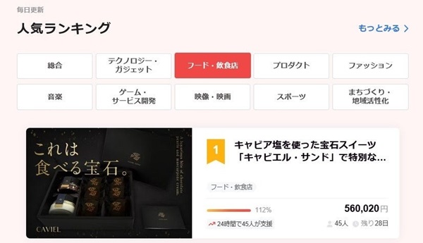 2025年6月に誕生したワンポが開発支援する、広島県広島市の宝石スイーツ専門店「ビジュエルパフェ」の新作「キャビエル・サンド」が、CAMPFIREでのクラウドファンディングプロジェクト公開初日でファーストゴールを達成し、「フード・飲食店」カテゴリーで第1位を獲得した。