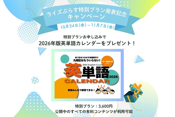 キャンペーン期間中、「ライズぷらす×英単語カレンダーキャンペーン特別プラン」月額1,200円(税込)の3ヶ月特別コースに入会した人全員に、英語学習を毎日楽しく続けられる人気教材「RISE English Course 英単語カレンダー2026」を無料プレゼントする。