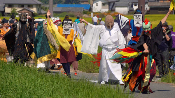 9月27日(土)に行われた「行道(練り歩き)」で、仮面を被った人々が村を練り歩く光景は、訪れた人々に古代の息吹と現代の創造性の両方を感じさせ、まさに“時空を超えた祭礼”になったとのこと。『伎楽』の復活は、歴史的資料を再現するにとどまらず、現代的な表現やテクノロジーを交えて再構築する試みだ。