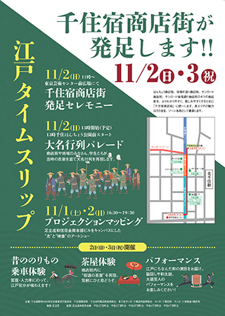 11月2日(日)には、東京芸術センター前広場にて「千住宿商店街発足セレモニー」を開催。2日(日)・3日(月・祝)には、大名行列や茶屋体験、特別メニューなどが楽しめる「江戸タイムトリップ」も行われる。