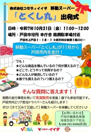 買い物に困っている高齢者などへの生活支援サービスとして期待される、コモディイイダと提携した移動スーパー「とくし丸」が、11月から埼玉県戸田市内で運行を開始する。