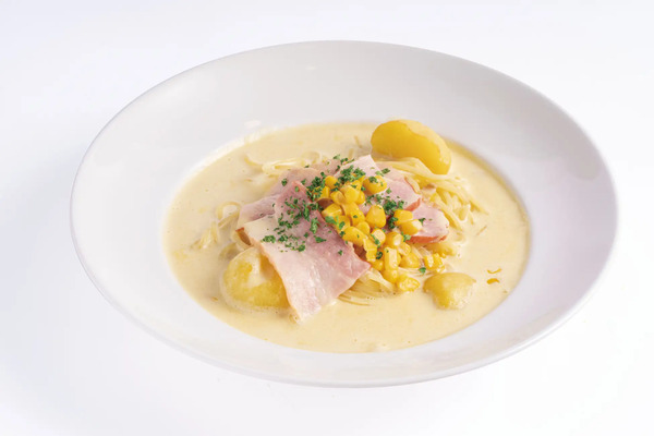 「パスタ屋一丁目」の人気メニューの一つである「ポテトベーコン」は、大きめカットのベーコンにポテトを合わせ、特製のコーンクリームスープで仕上げた、子どもから大人まで楽しめるメニュー。