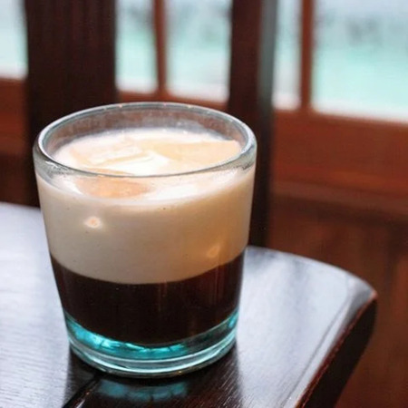 オリジナルブレンド茶葉、ミルクティー専用のミルク、特注の琉球グラスがおりなす「アイスミルクティー」は、毎日時間をかけて店内で仕込みむ一杯。2層に分かれたまま、混ぜずにそのまま味わうことができる。