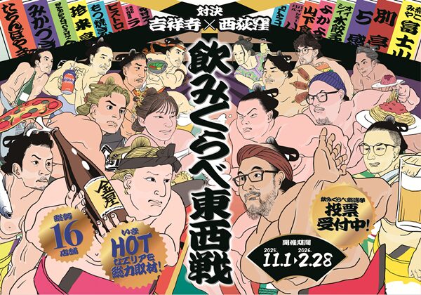 多くの居酒屋がひしめく中央線沿線の人気エリア「西荻窪」と「吉祥寺」。2つの街を舞台に、相撲の世界観をテーマにした対決型グルメイベント「西荻窪×吉祥寺 飲みくらべ東西戦」が開催される。開催期間は11月1日(土)~2026年2月28日(土)。クーポン券や力士風の店主似顔絵ステッカーなどを入手できるお得なイベントだ。