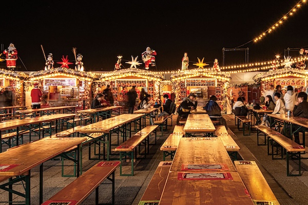 グリューワインやホットココア、焼き菓子やソーセージなど、心も体もあたたまる冬の味覚を堪能でき、会場全体がイルミネーションに包まれるなか、幻想的なセレモニーとして楽しむことができる。