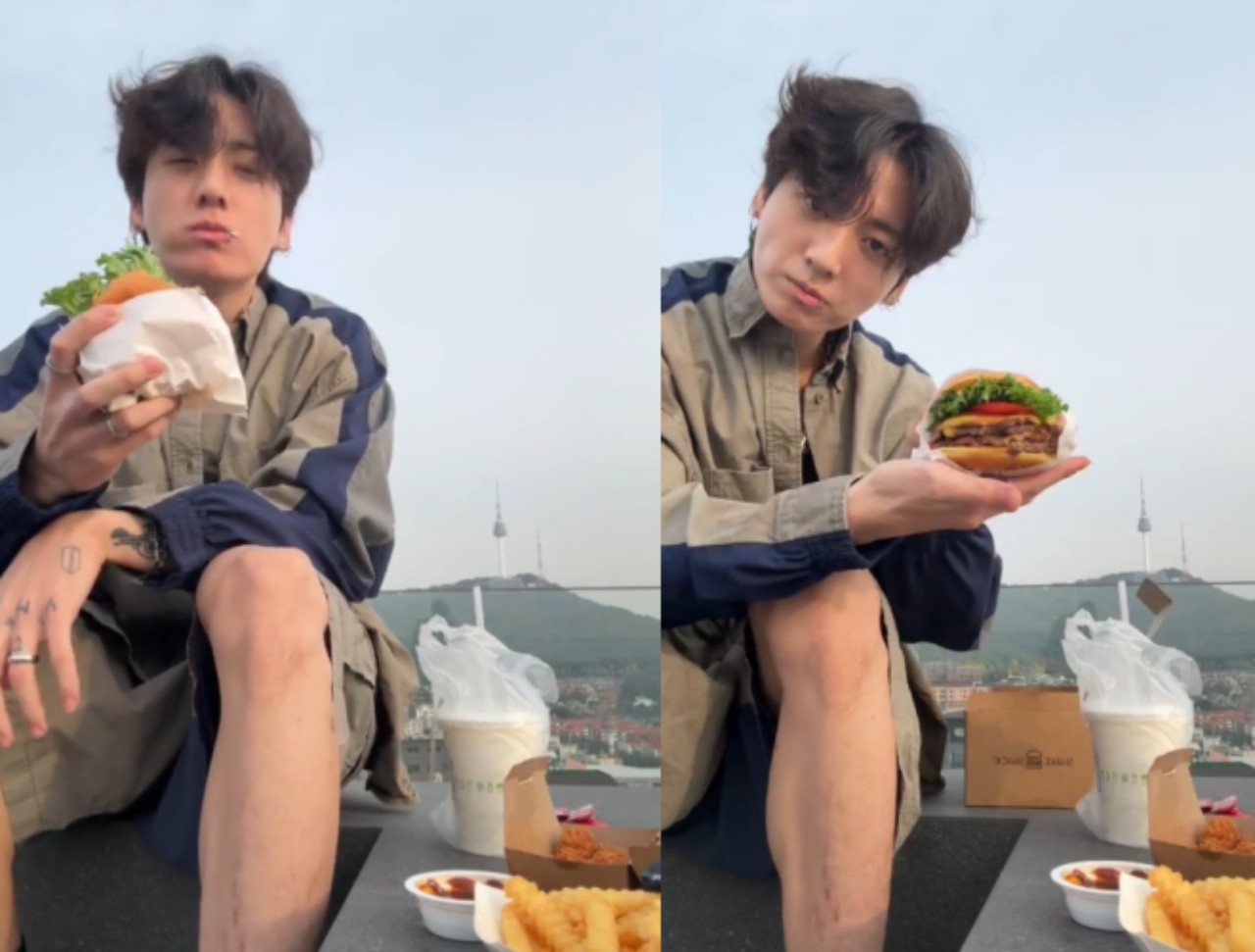 JUNG KOOKはハンバーガーを美味しそうに食べながら、ファンにも「ハンバーガー食べてね」と勧め、親しみやすく交流しました。