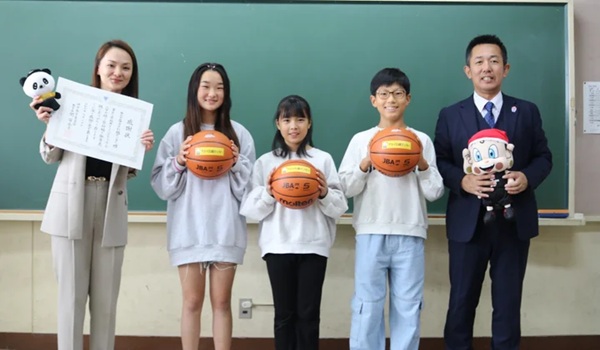 サカイ引越センターは、プロバスケットボール「B.LEAGUE」大阪エヴェッサを通じて、堺市東区の小学校9校にバスケットボール3球ずつ、合計27球を寄贈した。