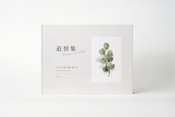 180度に開くレイフラット製法だからアルバムが見やすく、中頁にはツヤ消しコーティングで落ち着いた仕上がりのマット紙を採用した。「追憶」が花言葉のユーカリをあしらった表紙には、故人の名前や日付を入れることもできる。