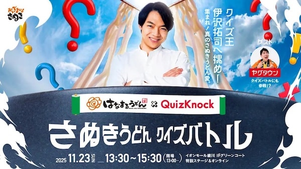 「さぬきうどん クイズバトル」では、QuizKnockの伊沢拓司氏、讃岐うどんYouTuberのヤグタウン氏が登壇し、讃岐うどんの歴史や文化、はなまるうどんのおすすめメニューなどについて語るトークショーを実施する。