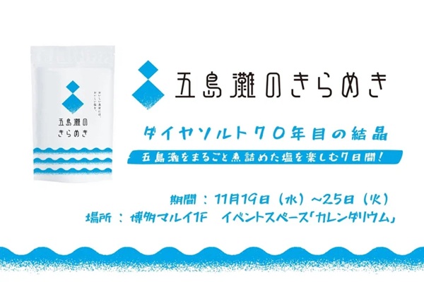 ダイヤソルトは、長崎県西方の五島灘の海水を平釜でじっくり煮詰めて作った新商品「五島灘のきらめき」の直売イベントを、11月19日(水)〜25日(火)の7日間、博多マルイ1Fイベントスペース「カレンダリウム」にて開催する。