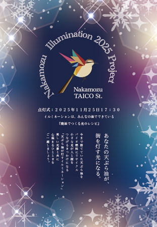大阪府堺市北区の「中百舌鳥駅前通商店街振興組合」は、「あなたの天ぷら油が、街を灯す光になる」をテーマに、「中百舌鳥イルミネーション2025」を11月25日(火)〜12月26日(金)にデイリーカナート中百舌鳥店付近にて初開催する。11月25日(火)17時30分には点灯式が行われる。